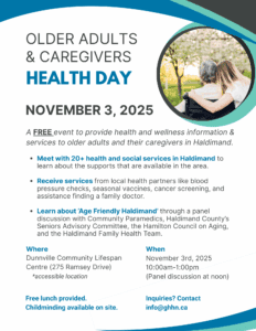 This event runs from 10:00 a.m. until 1:00 p.m. It is a FREE event to provide information and services to older adults and their caregivers in Haldimand County. See attached flyer for more details.